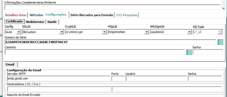 Correção 1: Ajustado bibliotecas de certificado para SSLLib = libCustom, CryWinCrypt, httpWinINet e xsLibXml2.