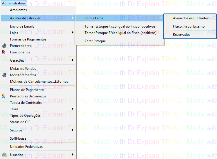 ACIMA - Localização dos Ajustes de Estoques no menu Administrativo do Sistema Retaguarda. Em destaque azul, as opções de ajustes para os estoques Avariados, Usados, Físico, Físco,Externo ou Reservados. Tudo com base na ficha de estoque.