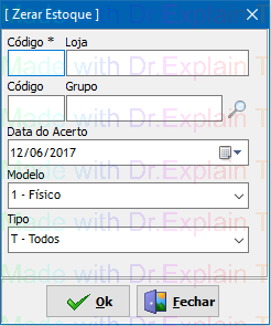 O estoque Físico ou Fiscal pode ser zerado utilizando essa opção. Para zerar o estoque é preciso escolher primeiramente a Loja, depois a Data do Acerto, o Modelo a ser zerado e por fim o Tipo de Acerto.