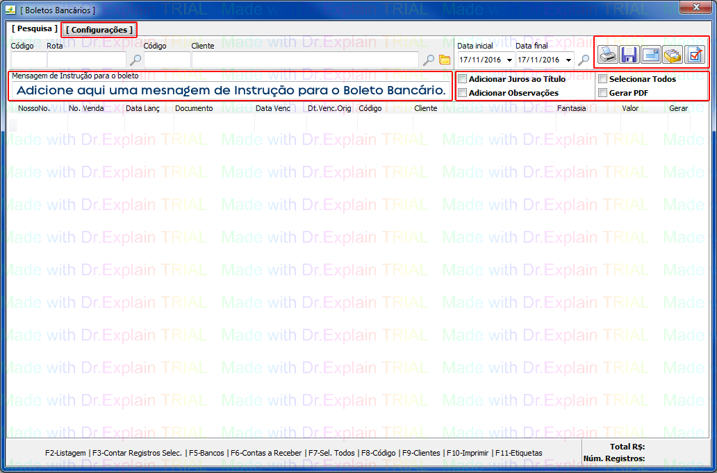 Abaixo as marcações para Adicionar Juros, Observaçõese Geração de PDF.