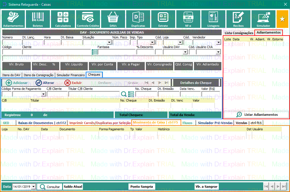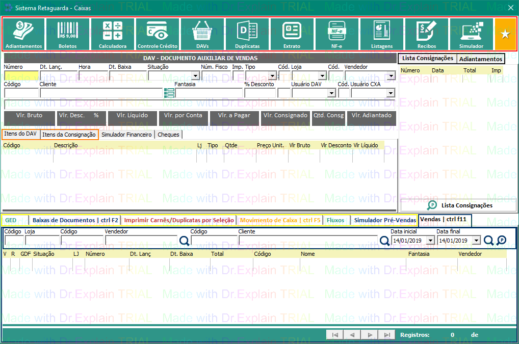 ACIMA - Tela Módulo de Caixa. No destaque em vermelho, os botões para realizar adiantamentos, gerar boletos, duplicatas, recibos, listagens, extrato e atalho para o DAV. . Em laranja, as abas com os produtos contidos na venda normal e consignadas. Em preto, as abas com a lista das consignações e adiantamentos realizados. Na cor amarela, as abas com os documentos para baixas, carnês e duplicatas, movimentos do caixa, fluxos e simulador de vendas. Na cor azul a aba de Vendas, local onde os lançamentos das vendas são encontados, sejam elas pendente, baixadas ou canceladas.