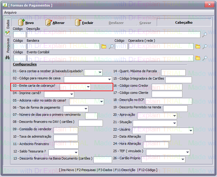 ACIMA - Tela de Formas de Pagamento. Em destaque o campo “Emite carta de cobrança?“ que define