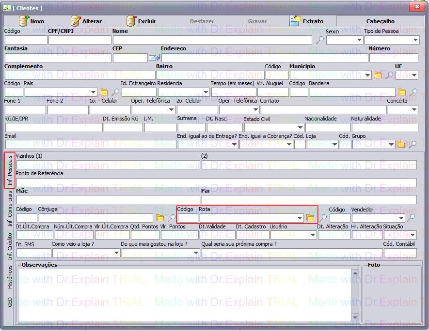 Em destaque o Campo Rota que atribuirá o Cliente a uma Rota para que se possa utilizar em futuras listagens de Cobranças filtradas por rotas.
