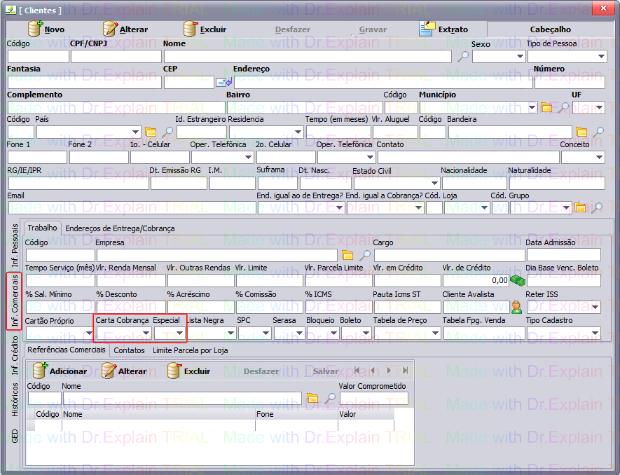 ACIMA - Tela Clientes na aba Informações Comerciais. Em destaque os Campos Carta Cobrança e Especial.