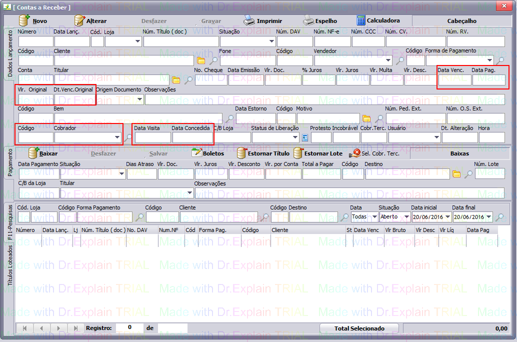 ACIMA - Tela das Contas a Receber. Em destaque vários Campos importantes ligados a Cobranças como o Valor Original, as Datas de Vencimentos e Pagamentos e o Cobrador.
