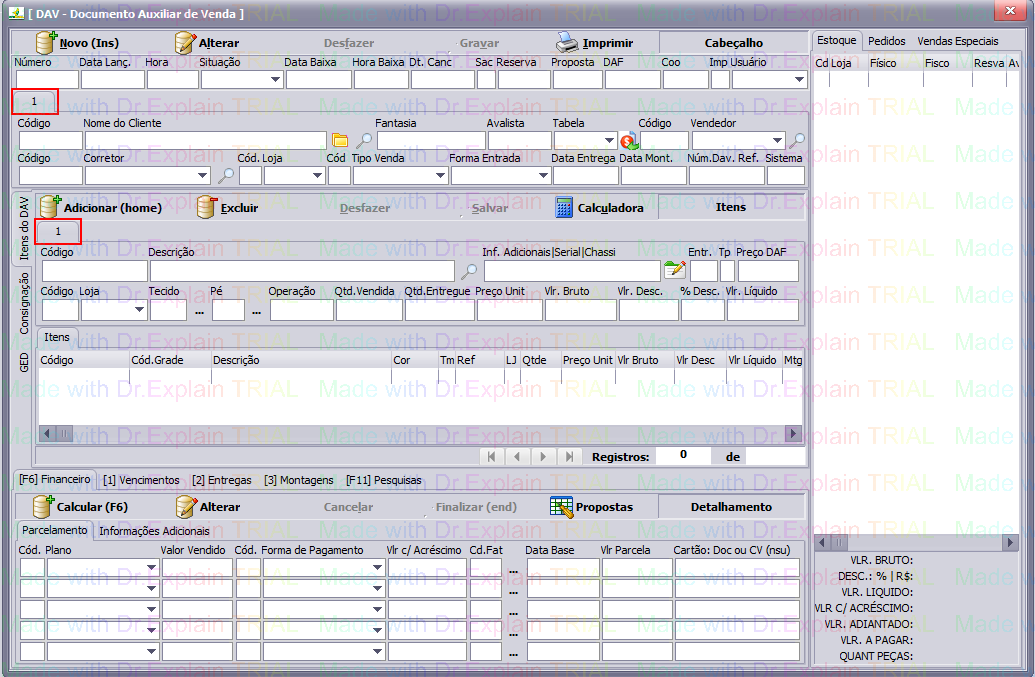 ACIMA - Tela de DAV(Documento Auxiliar de Venda). Todas as Vendas são lançadas nesta tela, juntamente com o Financeiro da mesma. No DAV também podem ser lançada