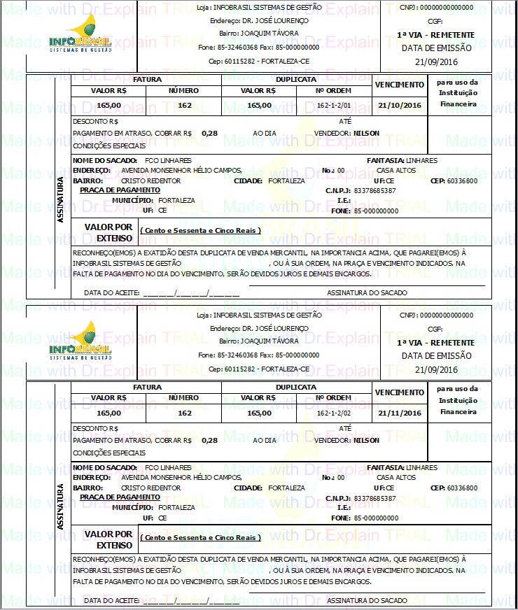 ACIMA - Exemplo de Duplicata de um lançamento no valor total de R$ 330,00 divididos em dois documentos para pagamento de R$ 165,00.