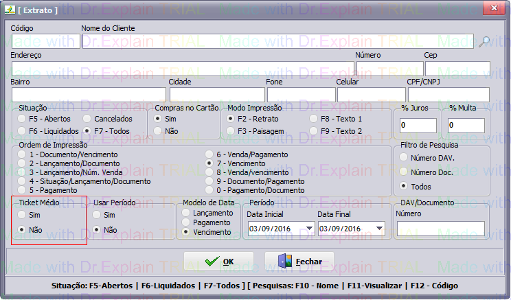 ACIMA - Tela de Extrato de Cliente. Em destaque, opção para mostrar o Ticket Médio do cliente.