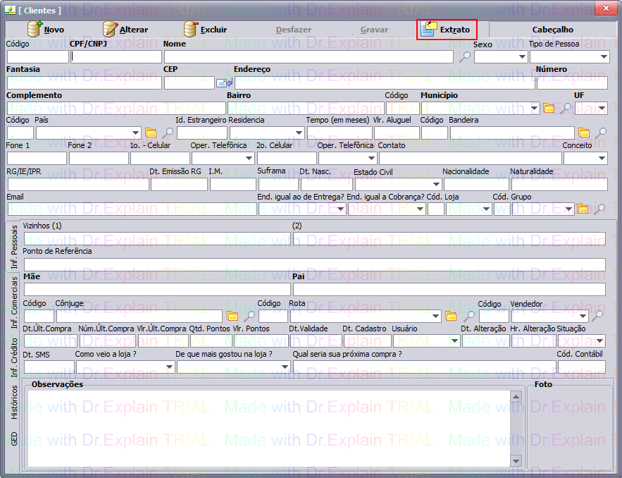 O Extrato também pode ser encontrado no topo da Tela de Cadastro de Clientes do Módulo CLIENTES.
