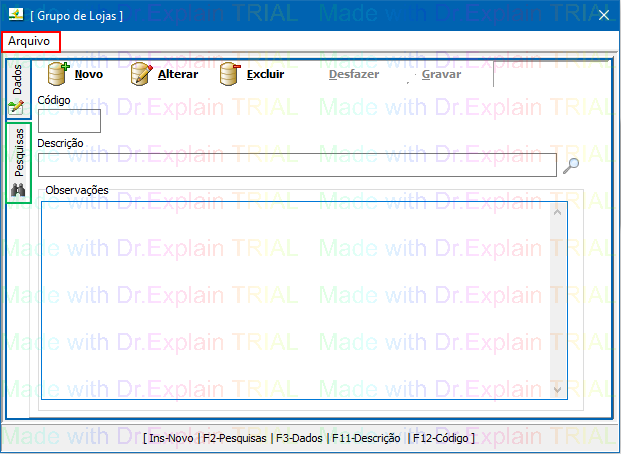 ACIMA - Tela de Grupos de Lojas. Em destaque vermelho, a opção de Arquivo para imprimir o documento com a lista dos grupos cadastrados. Em azul, o formulário Dados com os campos de cadastro dos grupos e observações. Em verde, a opção Pesquisas para visualizar na tela os grupos de lojas já cadastrados.