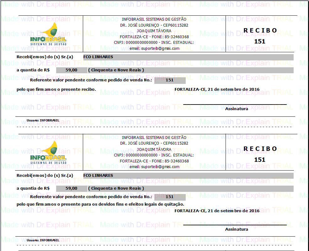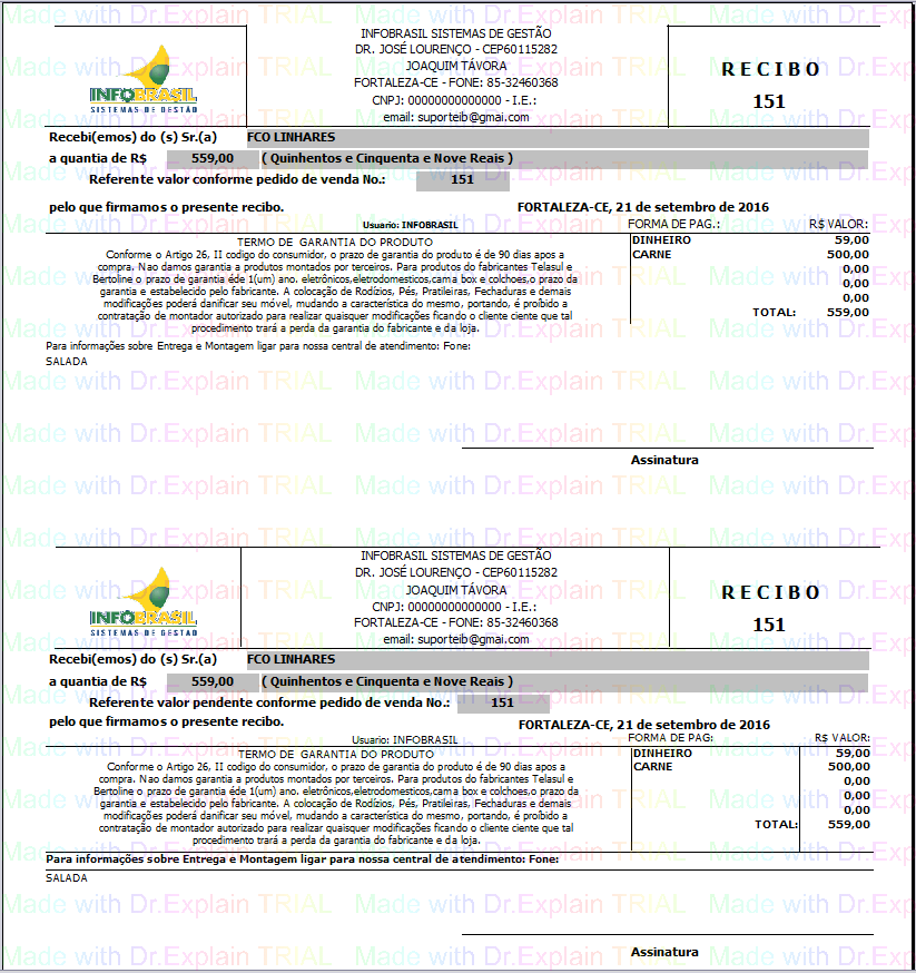 ACIMA - Exemplo Impresso de um Recibo da Venda 151. Modelo um (1), exibe a quantia total da venda independente da entrada.