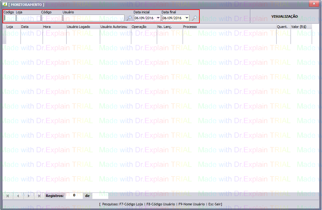 ACIMA - Tela de Monitoramentos. Monitoriza algumas operações realizadas por usuários logados no Sistema Retaguarda 6.1.