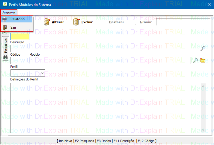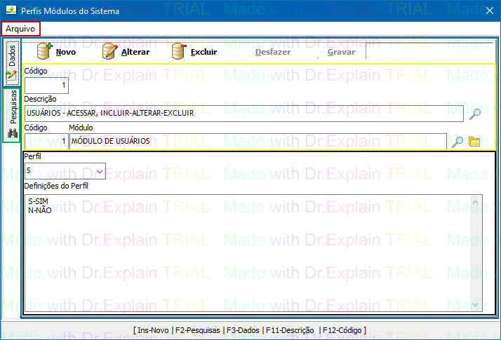ACIMA - Tela Perfis de Usuários. No destaque vermelho o menu Arquivo com a função Relatório. No destaque azul, formulário Dados com os campos Código, Descrição, Módulo, Perfil e Definições do Perfil. No Destaque verde, aba de Pesquisas para buscar a lista de perfis. No destaque amarelo, os campos com a descrição dos perfis e o módulo a que pertence. No destaque preto, a definição de sim ou não escolhida para o perfil.