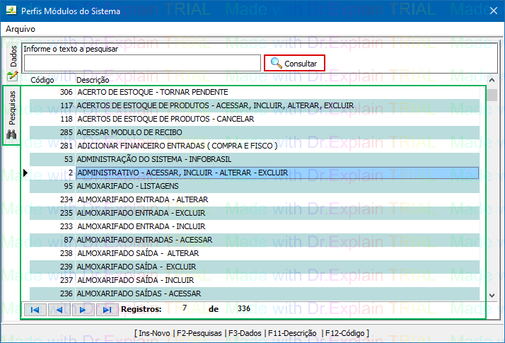 No destaque verde, aba de Pesquisas com tela de exibição dos códigos e descrições dos perfis de usuários.