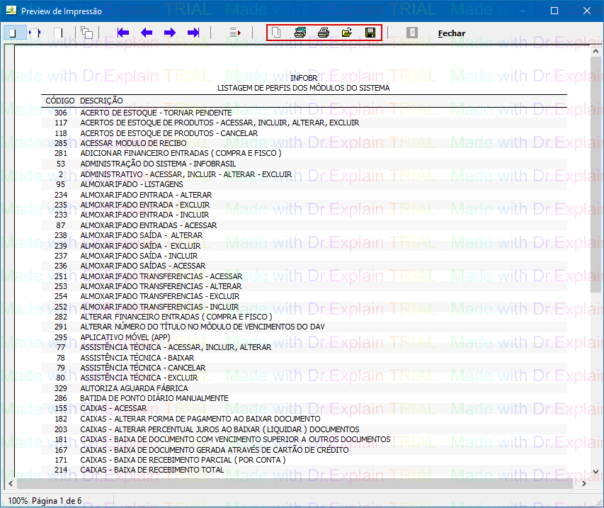 ACIMA - Tela de Perfis - Preview de Impressão. No destaque vermelho, funções para configurar, salvar e imprimir a lista com o relatório dos perfis de usuários.