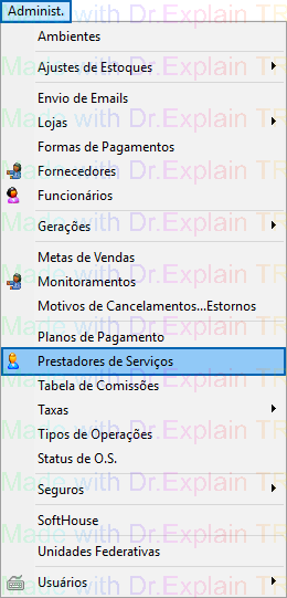 Localizada no Módulo Administrativo se encontra a opção para cadastrar os PRESTADORES DE SERVIÇOS.