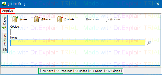 Em azul, formulário principal de Dados para cadastrara as funções e aba de Pesquisas para exibir na tela funções cadastradas.
