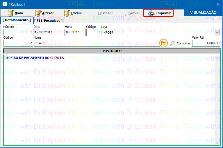 Lembrando que o Retaguarda irá juntar as informações preenchidas em detalhamento com um texto já padrão do sistema, declarando o recebimento dos valores especificados. Com isso o usuário poderá realizar a impressão do comprovante no botão Imprimir*.
