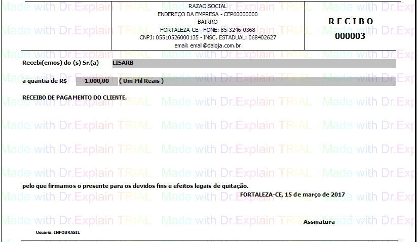ACIMA - Exemplo de um recibo criado e impresso utilizando o Modelo 1 - Simples Forma Gráfica.